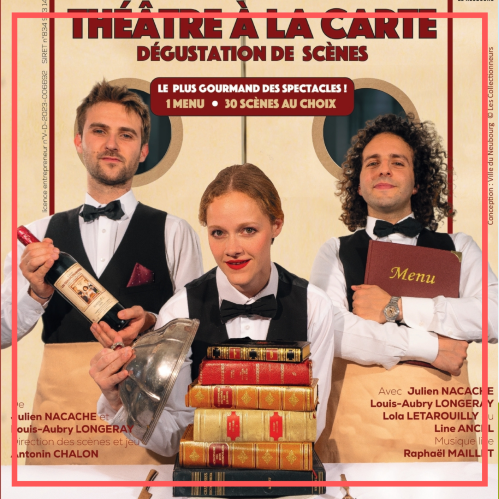 Une sélection en 6 services savamment mitonnée de textes cultes choisis aux petits oignons, bardée d'une mise en scène corsée, virevoltante et inventive, déglacée par trois interprètes saisissants et un musicien intense composant un quartet étoilé, sauront charmer sens et papilles grâce à leur talent empreint d'un univers digne de Devos comme des Deschiens, en passant par la fantaisie débridée d'un esprit très cartoon. Théâtre à la Carte, c'est un spectacle intelligent, immersif, drôle et musical…à savourer comme un met délicat, sans modération aucune !